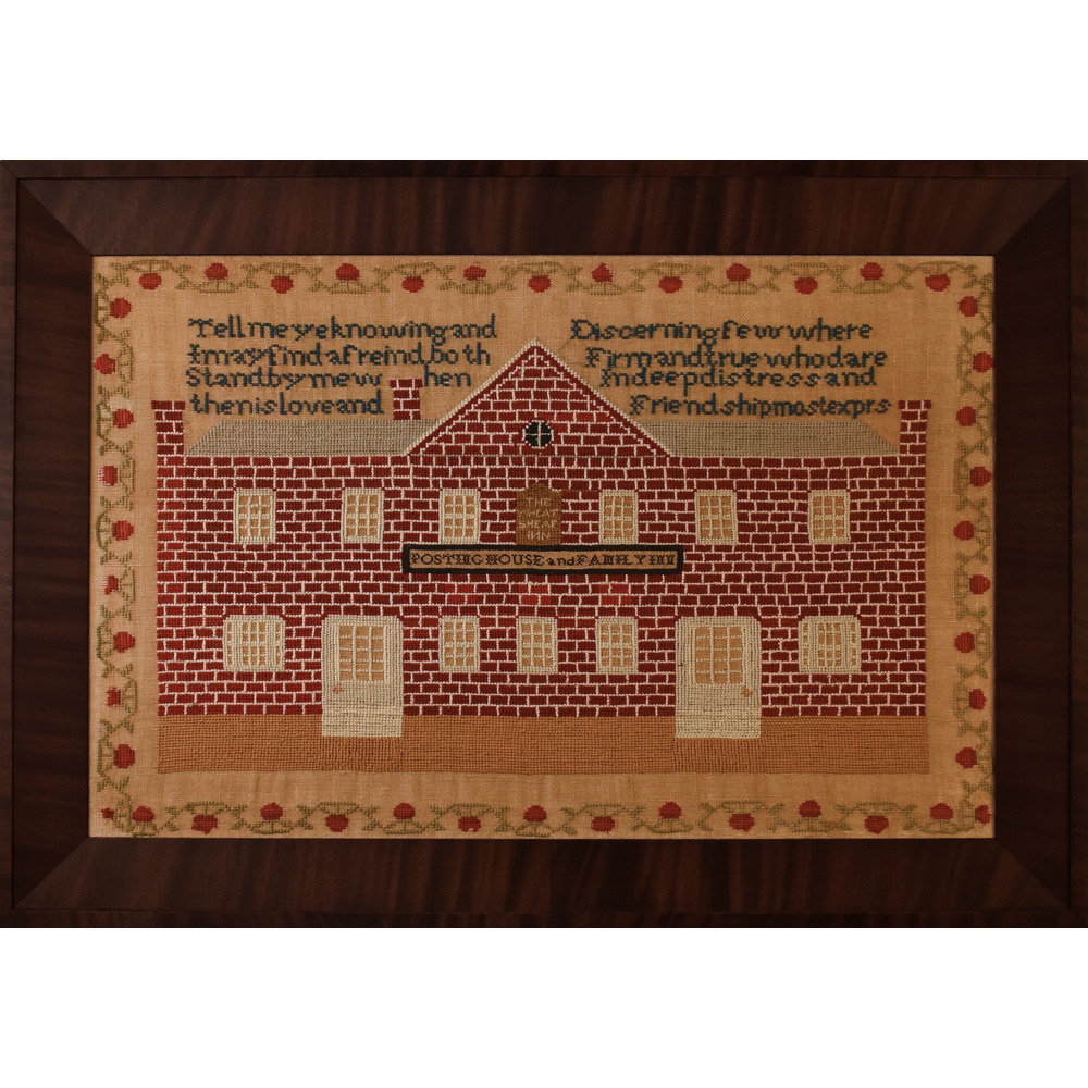 We are particularly fond of samplers that depict large buildings that practically fill the entire work and have known of both English and American examples, generally made in the mid-19th century. This is one of the most appealing of its genre, portraying a large, graphic brick building with detailed signage, windows and doors. The signs state that this was The Wheat Sheaf Inn, a Posting House and Family Inn. A posting house was an inn, generally rural, where horses were also kept and could be rented or changed out by a postmaster. Horses and drivers for private coaches were also made available for hire.