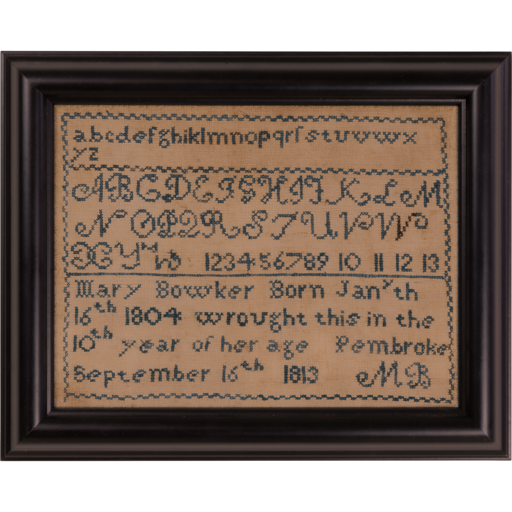 A charming little sampler, this was made by Mary Bowker who was age 9 (“in the 10th year of her age”) and living in Pembroke, a small town located about 13 miles north and a little west of Plymouth. Her neatly stitched inscription provides the specifics about her birth date, her age and her town, ending with her initials worked in the scripted alphabet that she practiced in the uppercase alphabet above.
