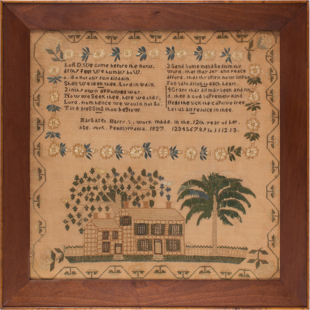 It is signed, "Margaret Harry's work made in the 12th year of her age York Pennsylvania 1827." The moralistic verse and the inscription are framed within a praiseworthy enclosure of fine flower blossoms and leaves.