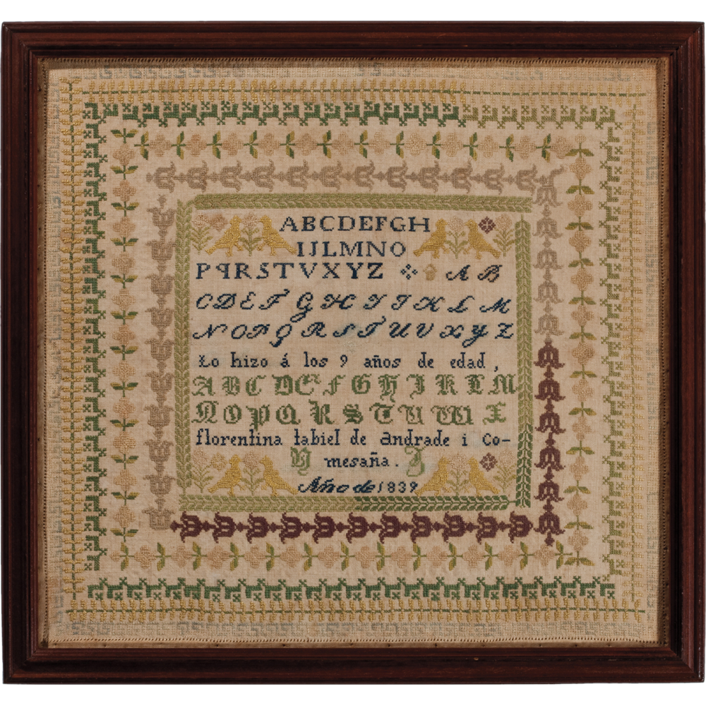 Excellent sampler made by nine-year-old Florentina Tabiel de Andrade i Comesaña in 1839. This sampler, along with 11 others, is discussed in a recent essay, Samplers from Spain: An Introduction by Dr. Lynne Anderson, Founder and Director of the Sampler Consortium and Director of the Sampler Archive Project, which can be read here: https://www.samplings.com/samplers-spain-introduction