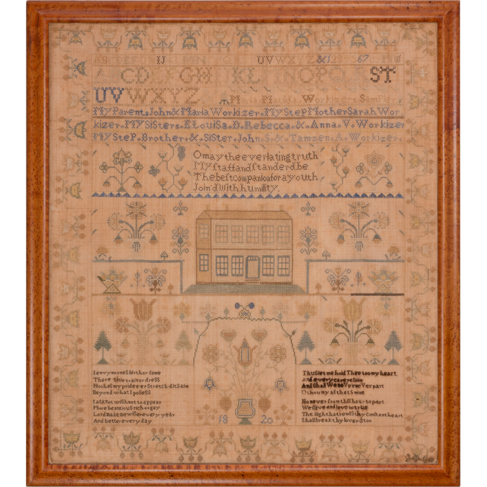 A highly developed, very large sampler, this was made by Maria Matilda Workizer in 1820 and features an excellent and very appealing composition. The central focus is a substantial house shown in three-quarter view with four chimneys, along with a wide assortment of classic needlework motifs – flowers in urns, pine trees, baskets of fruit and others - that fill the entire sampler.