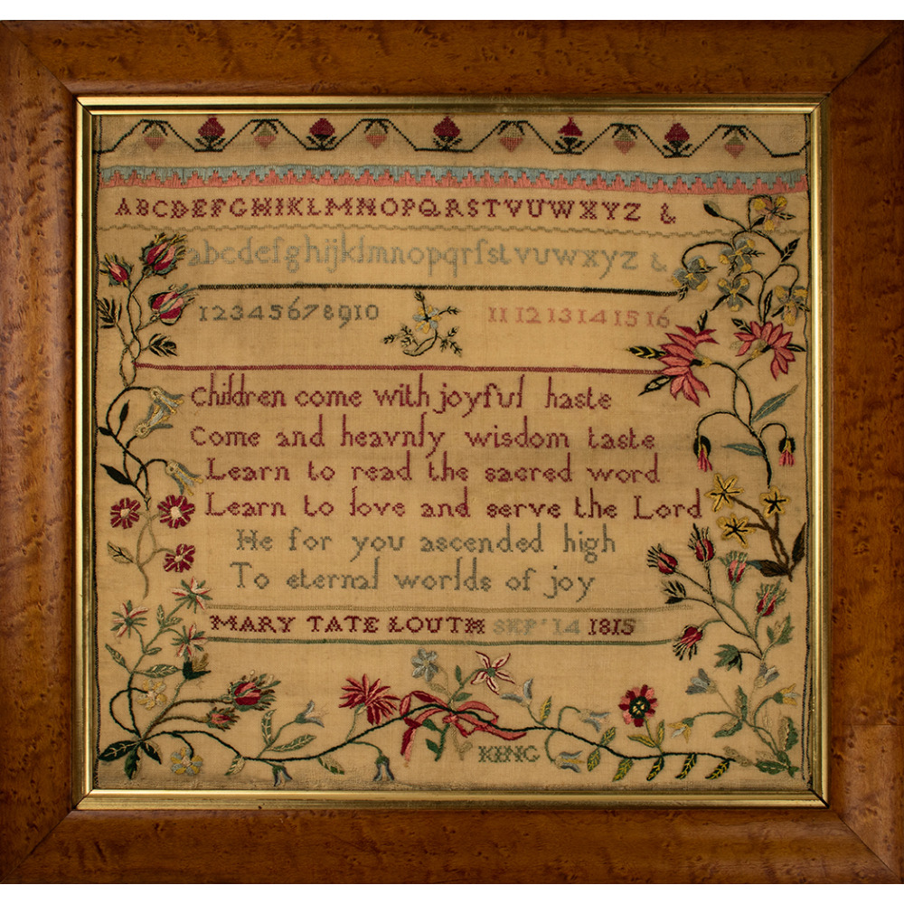 This was made by Mary Tate of Louth as she stitched on her delightful and skillfully worked sampler. She featured an upbeat religious verse nestled into an excellent three-sided border of flowers on a graceful, leafy vine, tied together at the bottom with a beautiful pink and red ribbon bowknot. A lovely pink and blue geometric band marches across the top of the sampler and Mary stitched the word, “King,” acknowledging George III, in the bottom border.