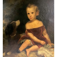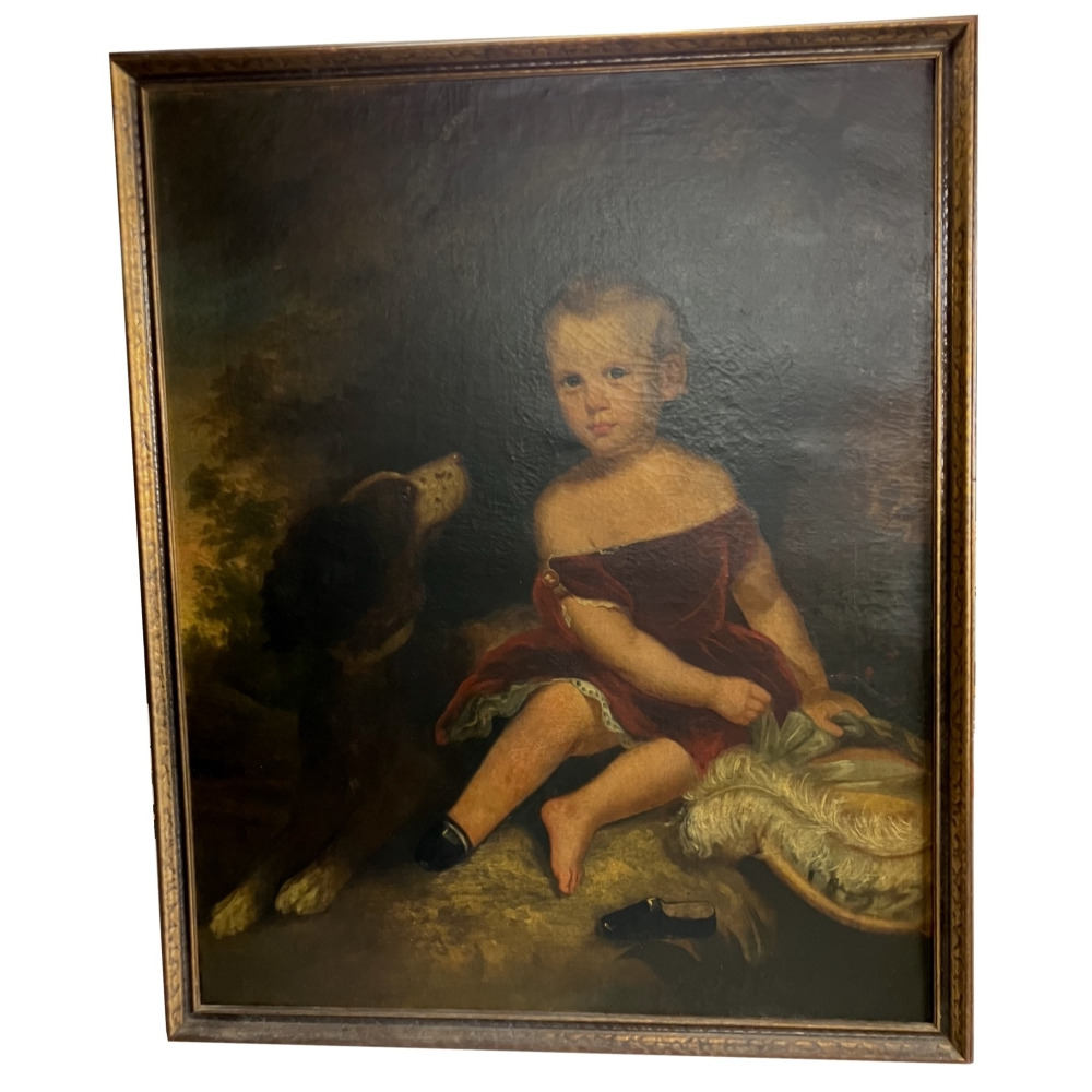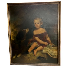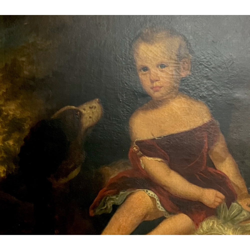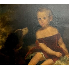 Little boy locks his dark eyes w/ the viewer. His loyal dog encircles him & looks adoringly up at his young masters face. This is not far from a classic Christ child composition w/ the family dog standing in for a lamb.