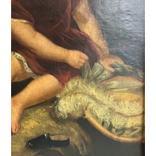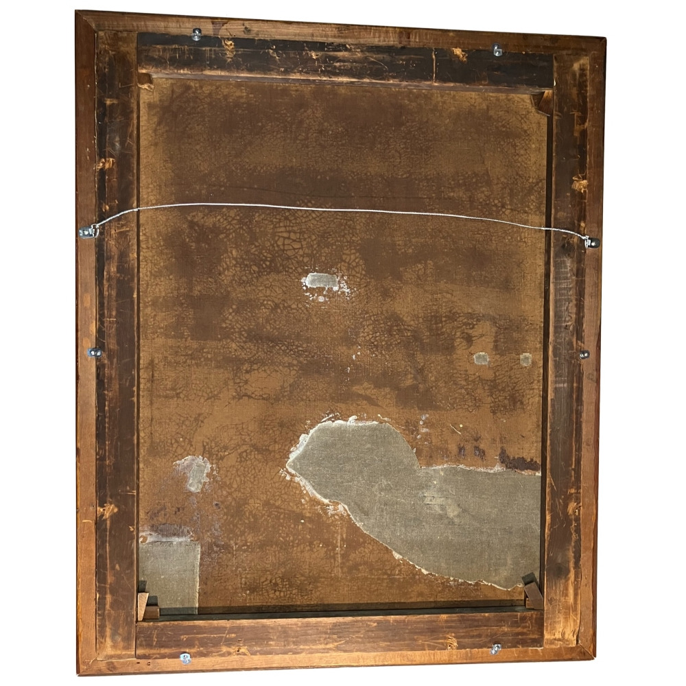 29 x 36” canvas on original stretcher. Conservative canvas repairs to stabilize tears & minor in-painting. Neatly accomplished.
