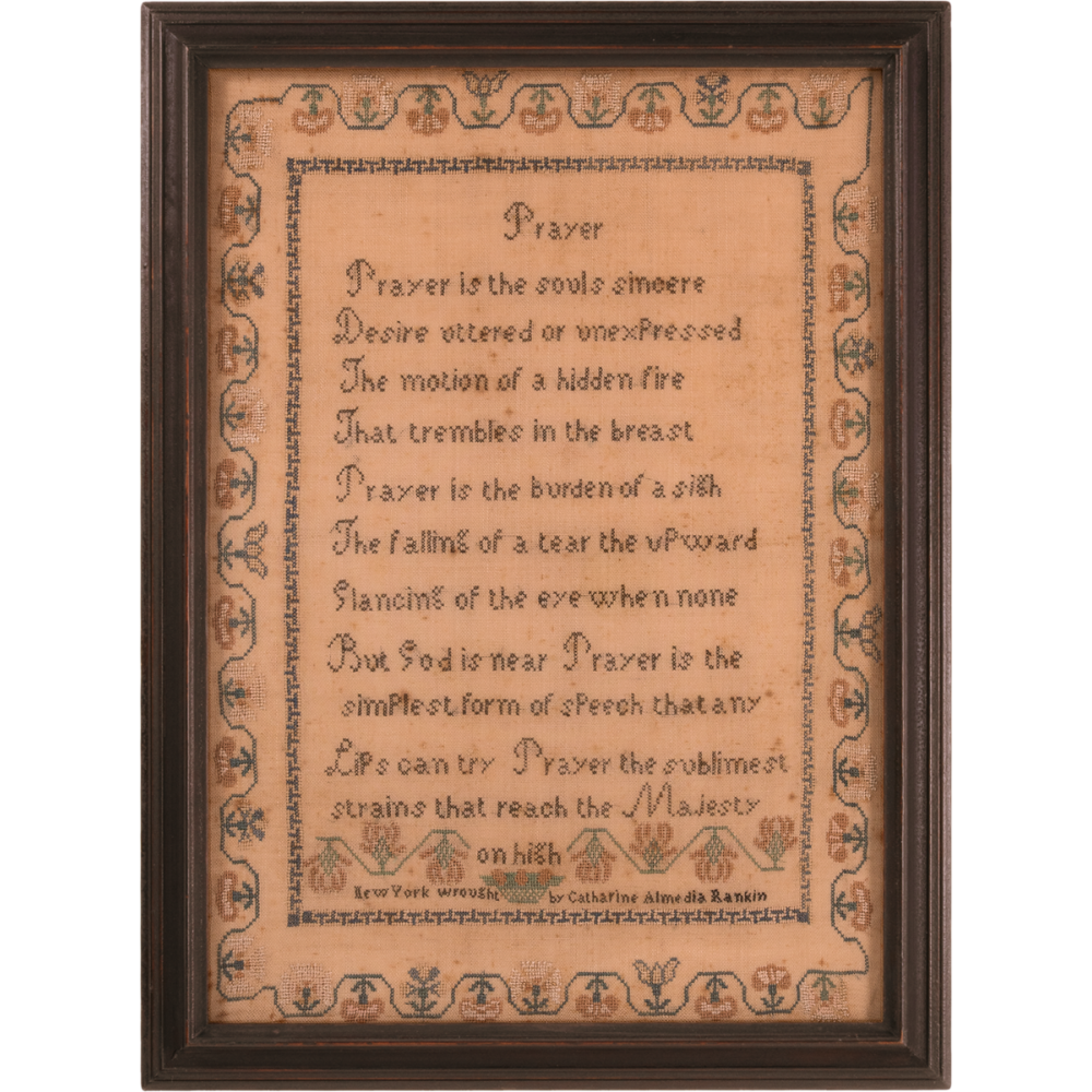 Many samplermakers stitched beloved psalms that were published and sung in the period. This one, written by the Scottish poet, editor and activist, James Montgomery (1771-1854) is called, “Prayer is the Soul’s Sincere Desire.” The sampler is signed, “New York wrought by Catharine Almedia Rankin,” and four stanzas of the psalm are centered and bordered by narrow Greek key inner border.