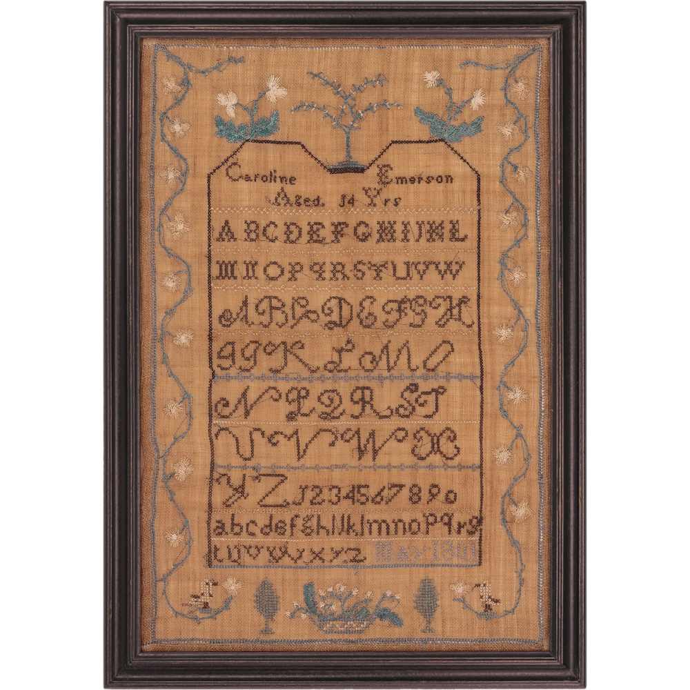 This handsome sampler, made at the very beginning of the 19th century, exhibits an interesting composition in the outline enclosure of the inscription and alphabets. A popular genre within this field is a type of sampler made in the early to mid-18th century which featured the ten commandments in a tablet structure with a double arch to the top. The format of Caroline Emerson’s sampler clearly echoes this earlier form.