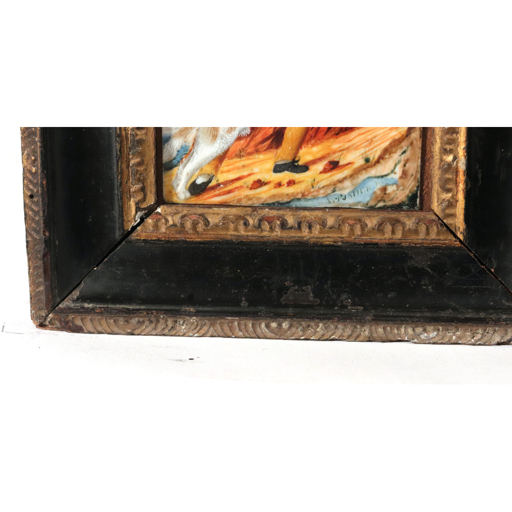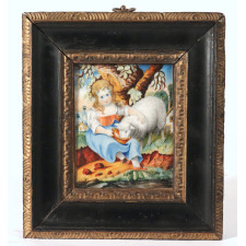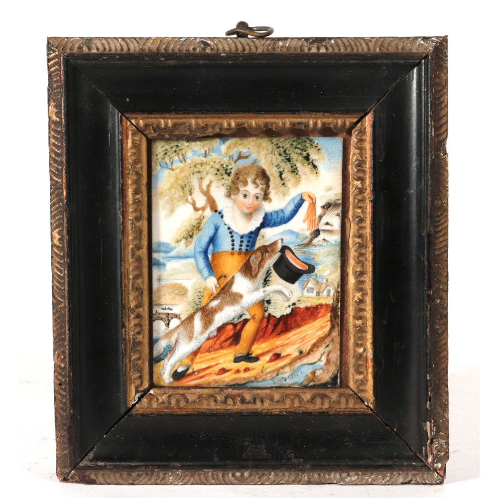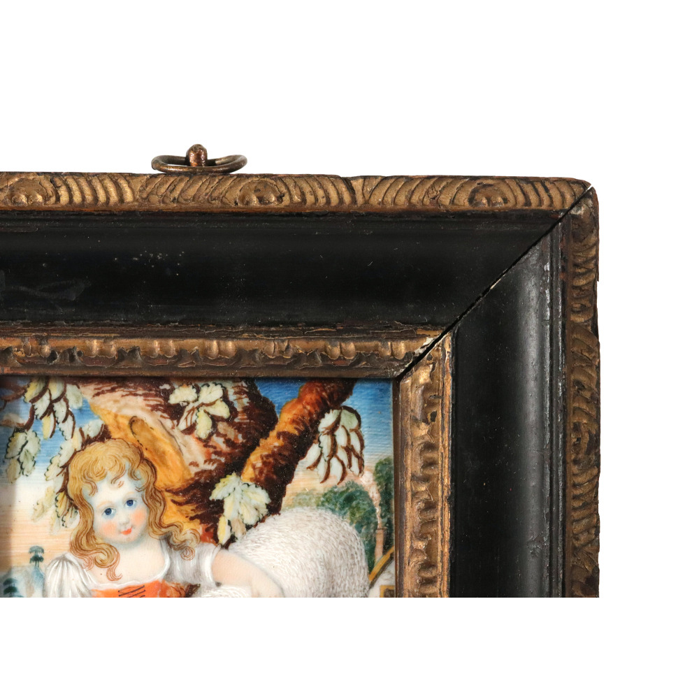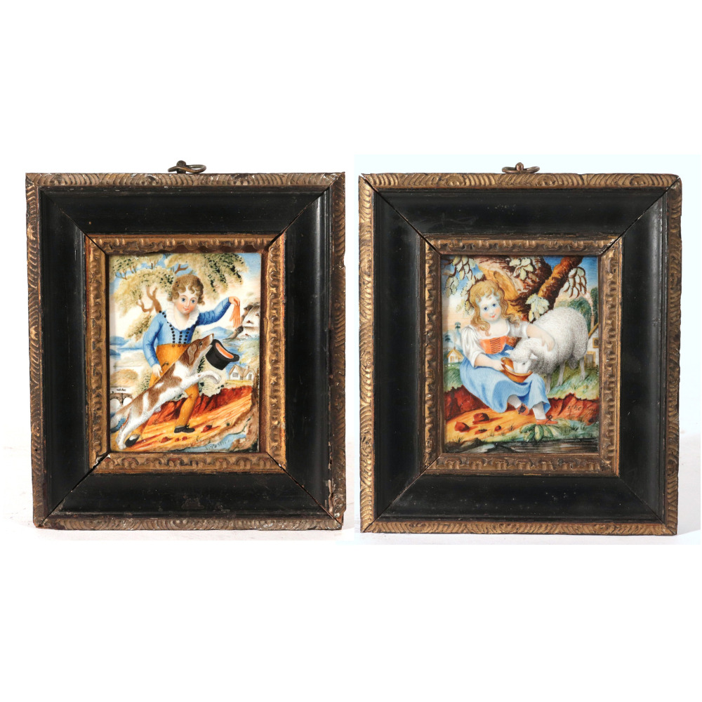 This enchanting pair of antique portrait miniatures offers a beautifully detailed, narrative glimpse into early 19th-century childhood. Executed in watercolor heightened with bodycolor on thin sheets of ivory (subsequently laid down on card), the translucent ivory gives the children's skin a luminous, glowing quality that was the gold standard for portraiture of the era. Both paintings are handsomely housed in matching rectangular dark wood frames, perfectly accented with intricately carved, gilt-molded inner slips.