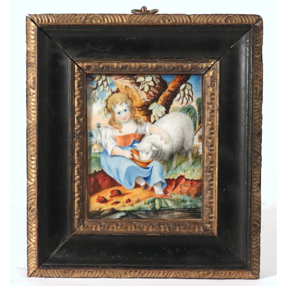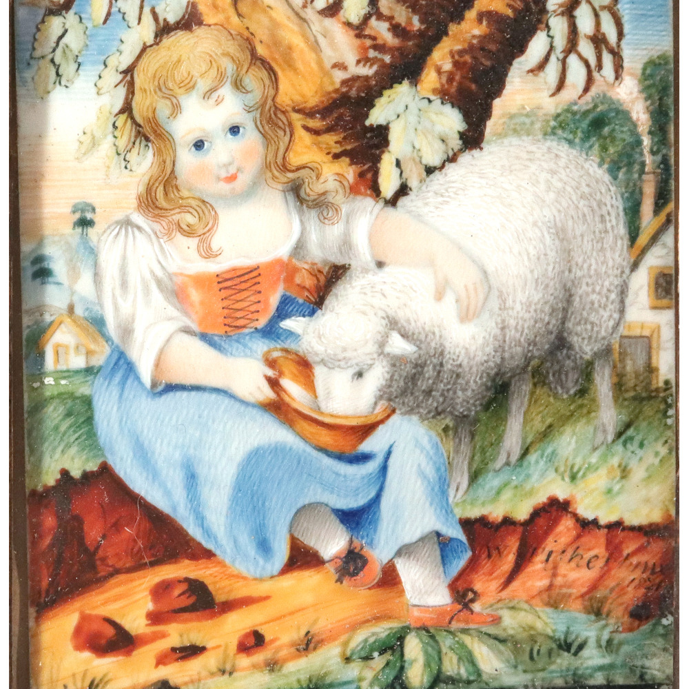 The Girl and Her Sheep: The charming companion piece features a young girl in a soft blue dress seated peacefully on a riverbank. She is shown feeding her pet sheep from a wooden bowl. The pastoral setting includes a large tree behind her, with one cottage visible in the immediate background and another nestled off to the left. A matching cursive signature reading Fisher, along with the date 1821, is visible in the earth just below her feet.