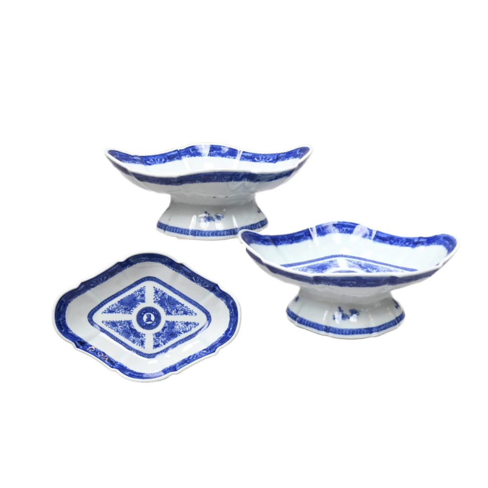 The compotes feature an elegant, diamond-like lozenge form. The central interior is beautifully decorated with the family crest enclosed within a classic roundel, which is flanked by four traditional clusters of flowers, fruit, and scholar's objects. This central imagery is framed by a highly detailed, cell-patterned border along the rim. The exterior foot of each compote is further decorated with delicate floral sprigs resting just above a matching cell-patterned band.