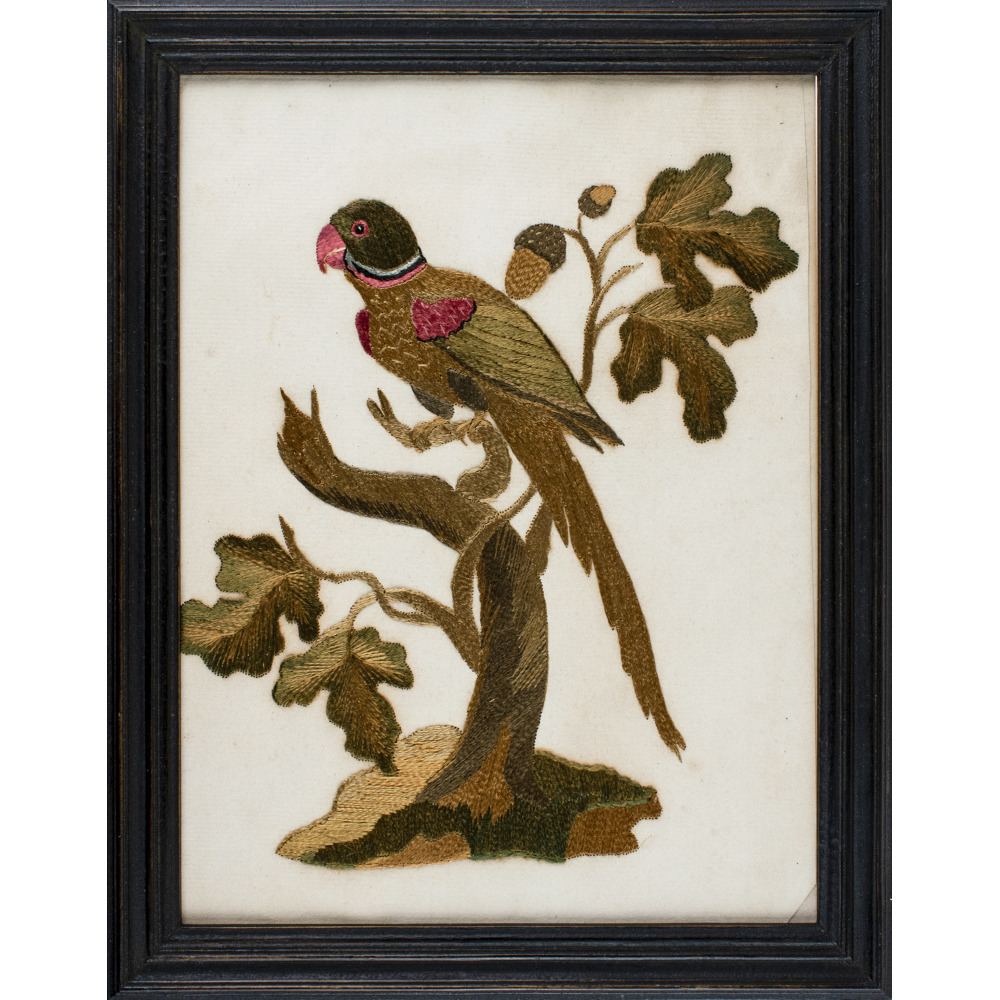 Needlework on paper has always interested collectors as it allows for no missteps – the hole made by the needle must be incorporated into the work. This is a delightful portrait of a large, exotic, long-tailed parrot perched on an oak tree. The parrot is beautifully rendered and the leaves, acorns, tree trunk and ground are all skillfully shaded.