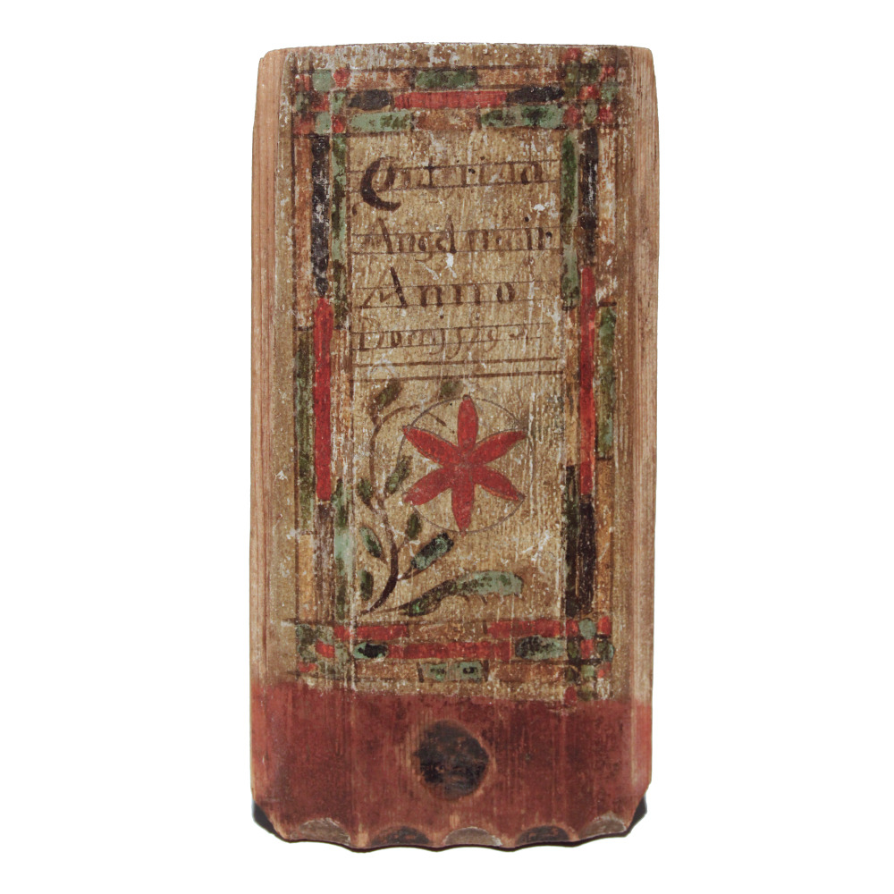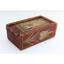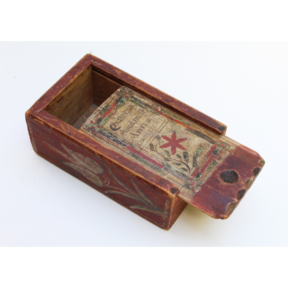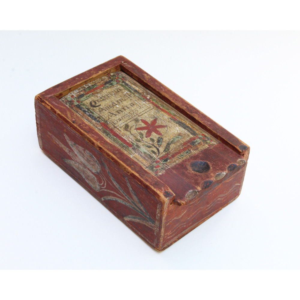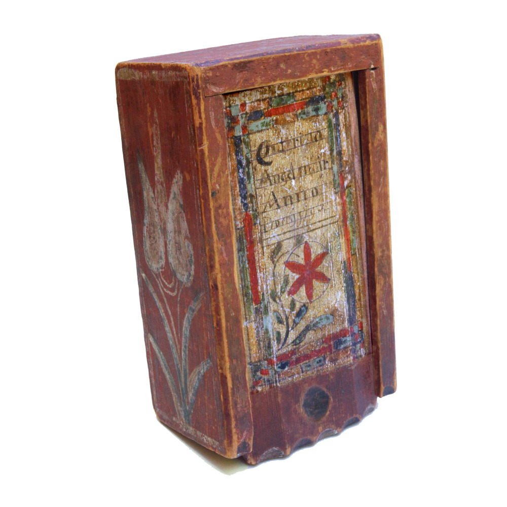 John Drissell (1762-1846) active from 1790 to 1817 in Lower Milford Township, Bucks County, PA. Drissell is renowned for distinctive painted woodenware, often featuring bold trilobed tulips, and inscription for whom it was made. This sliding lid box has both, tulips fill the side walls, and the lid lettered with what may be “Christina _____” and dated 1796. Prominent on the lid is a hex-pinwheel, as often seen on Pennsylvania barns. “Squiggle” lines decorate each end, all on a brick red ground.
