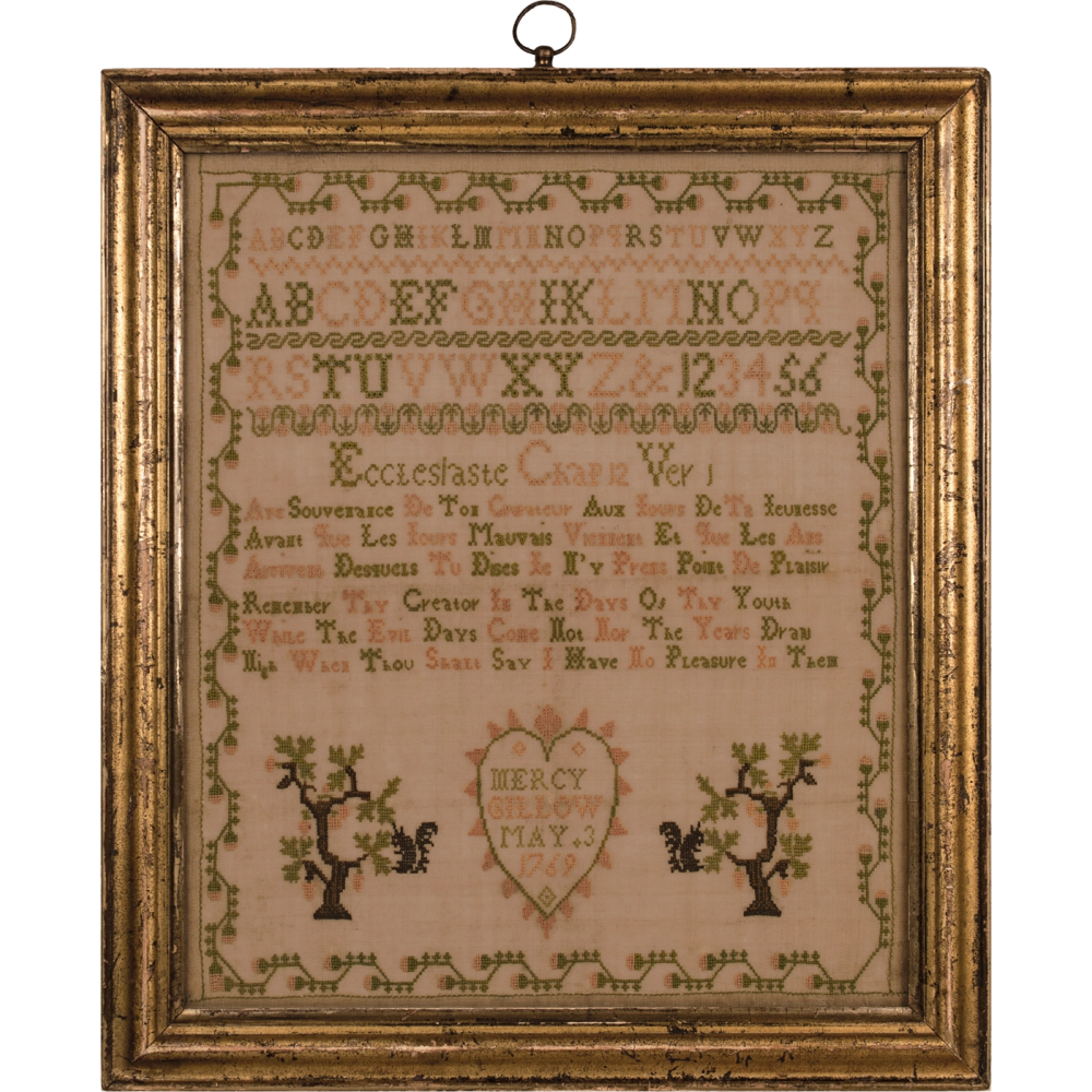 The sampler features a biblical verse in both French and English and is sophisticated as well as charming. Mercy surrounded her inscription with an unusual sawtooth heart flanked by squirrels and oak tree, all skillfully accomplished. The palette of predominantly light green and pale pink is one rarely found on samplers.