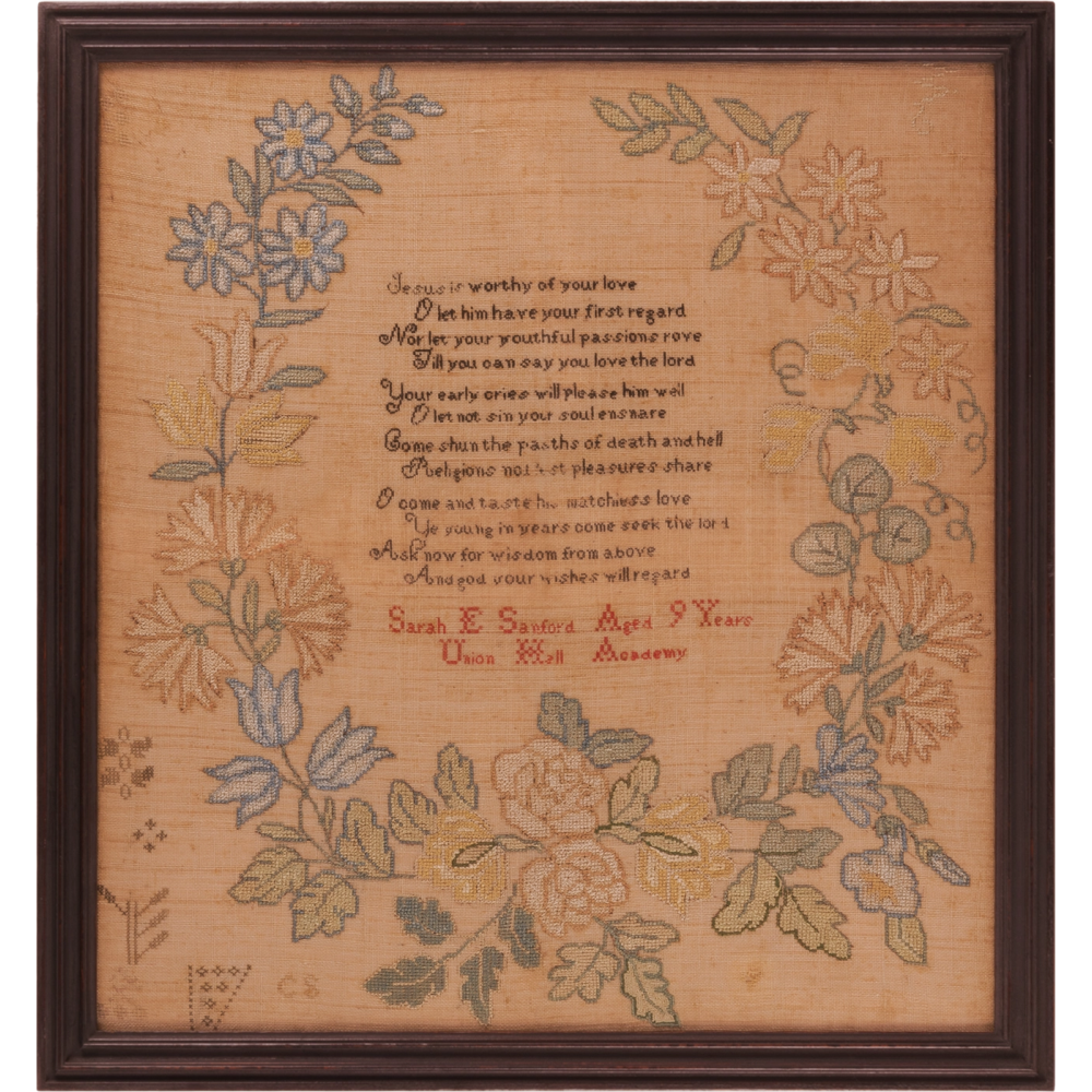 Sarah E. Sanford, age 9 and a student at Union Hall Academy in Jamaica, New York, worked this fine sampler with a religious poem centered within a very stylish flower wreath. The sampler brought this school, which was previously unknown to us, to our attention, and we became aware of another sampler made there. Now in the collection of the Hanover Historical Society in Plymouth County, Massachusetts, this was made by Abigail Hammett circa 1819.