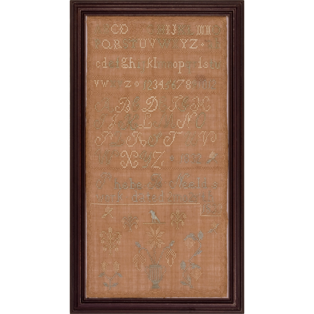 A subtle Quaker sampler, this is signed, “Phebe B. Neeld’s work dated 2 mo 25th 1833.” This translates to February 25 and is the way Quakers indicated dates. The lower register of the sampler presents several classic motifs favored by schools and teachers steeped in the Friends samplermaking tradition of Pennsylvania and New Jersey in the early 19th century. The striped vase with a star-shaped flower and two pendulous acorns is the most representative.