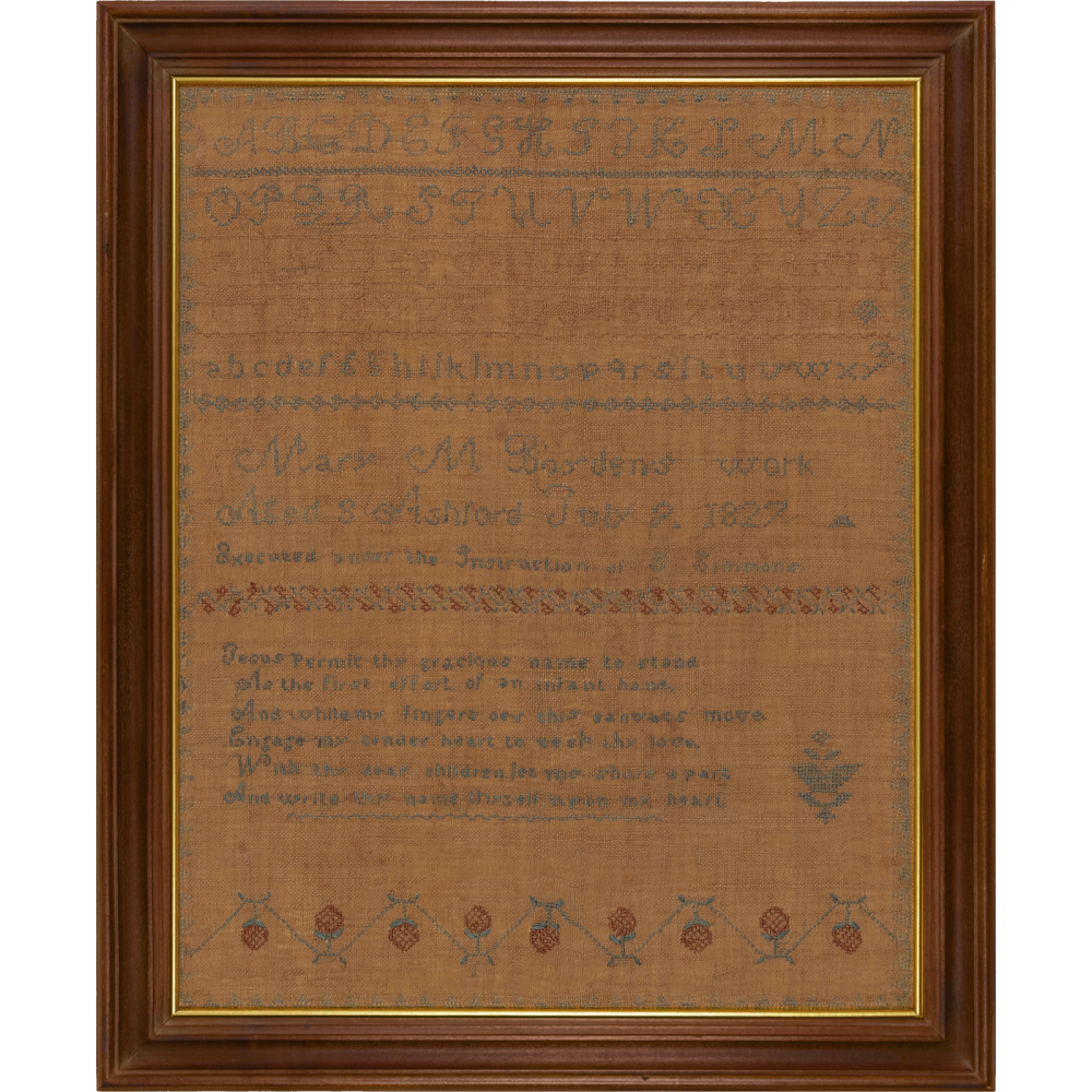 A large and very good sampler, this is signed with a wonderfully complete inscription - “Mary M. Boyden’s work / Aged 8 Ashford July 9, 1827 / Executed under the Instruction of S. Simmons.” The town of Ashford is about 30 miles east and a bit north of Hartford, and Mary Minerva Boyden was born there on August 26, 1818.