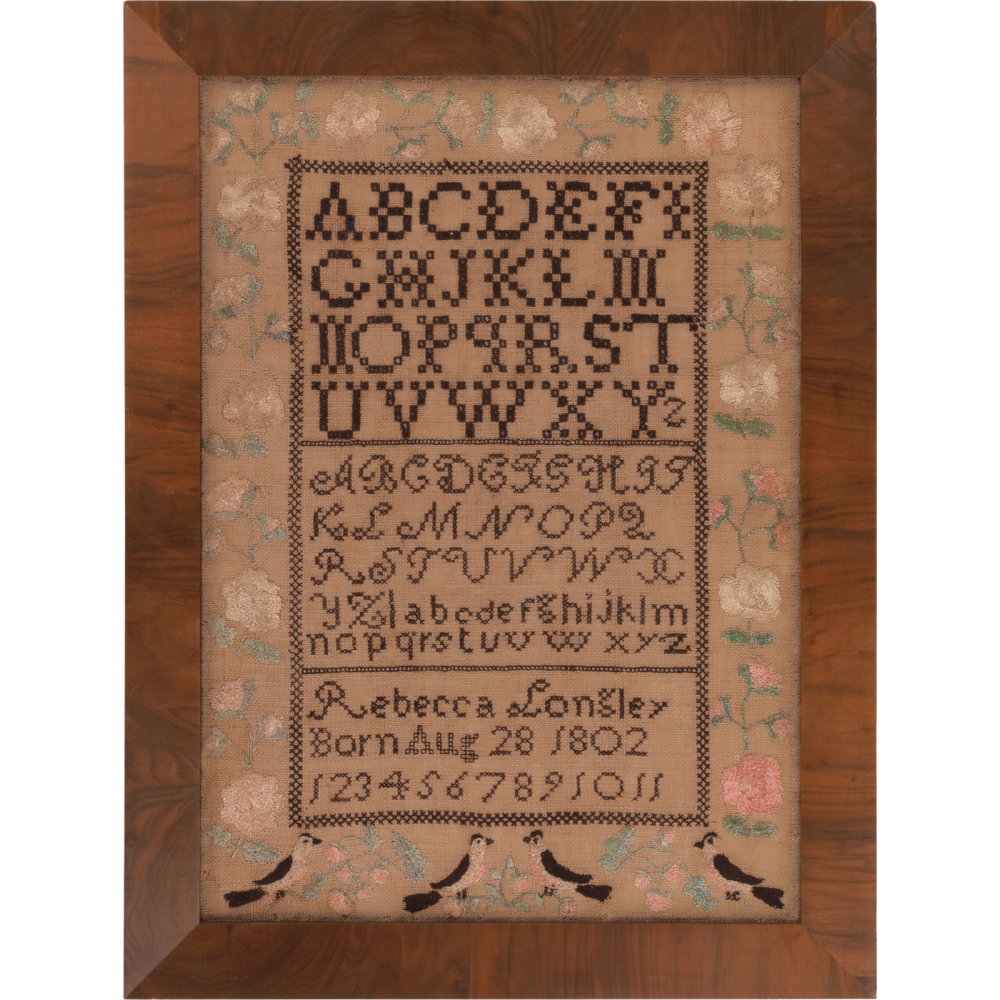 Some samplers present an appealing and classic composition featuring strong alphabets and an inscription surrounded by a floral border, and we find these to hold strong appeal. Rebecca Longley lived in Waterford, a small town in southwestern Maine, 10 miles north of Bridgton. She was the daughter of Eli and Mary (Whitcomb) Longley and was born as she stitched on her sampler, on August 28, 1802. She may have made her sampler under the instruction of a local teacher and was most likely between 10 and 13 years old at the time.