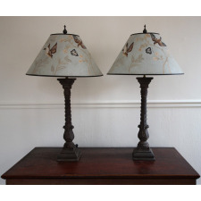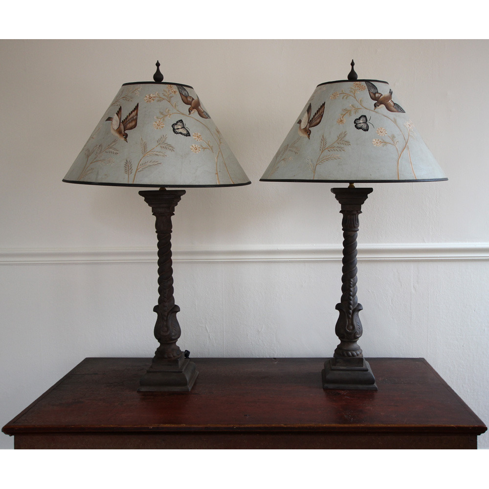 The small off-white fabic lampshades are included in the price of the lamps, but the hand-painted, light blue shades with birds and butterfly decoration are sold separately for $300.