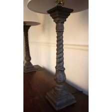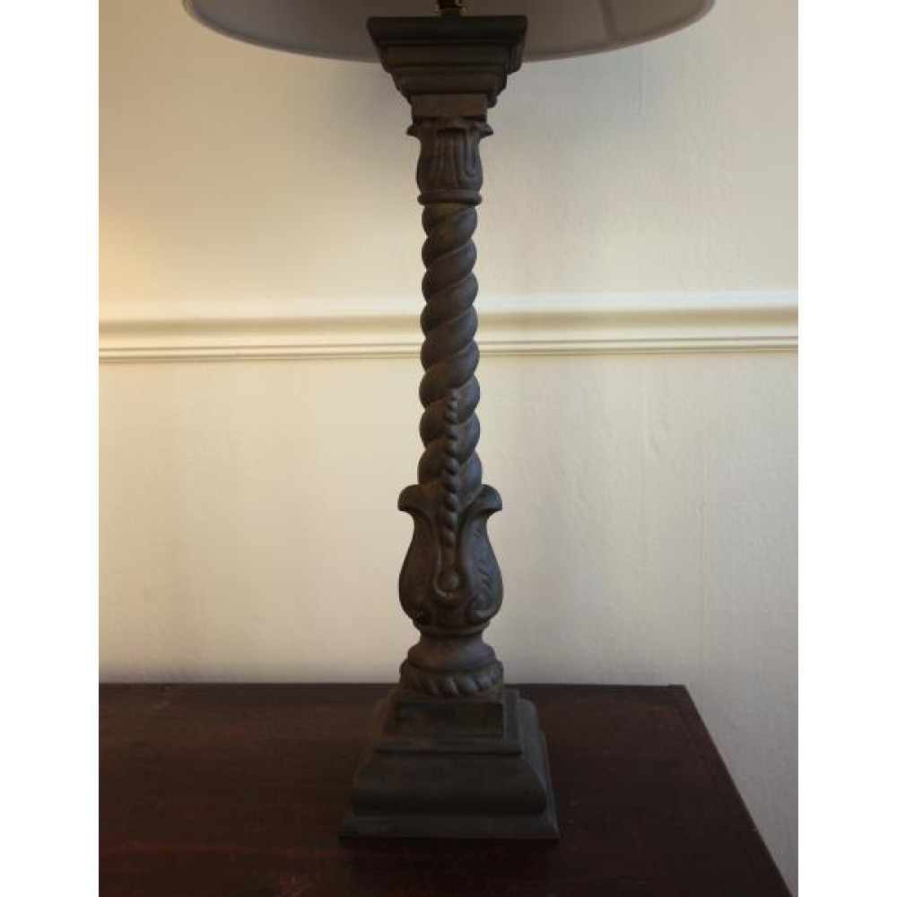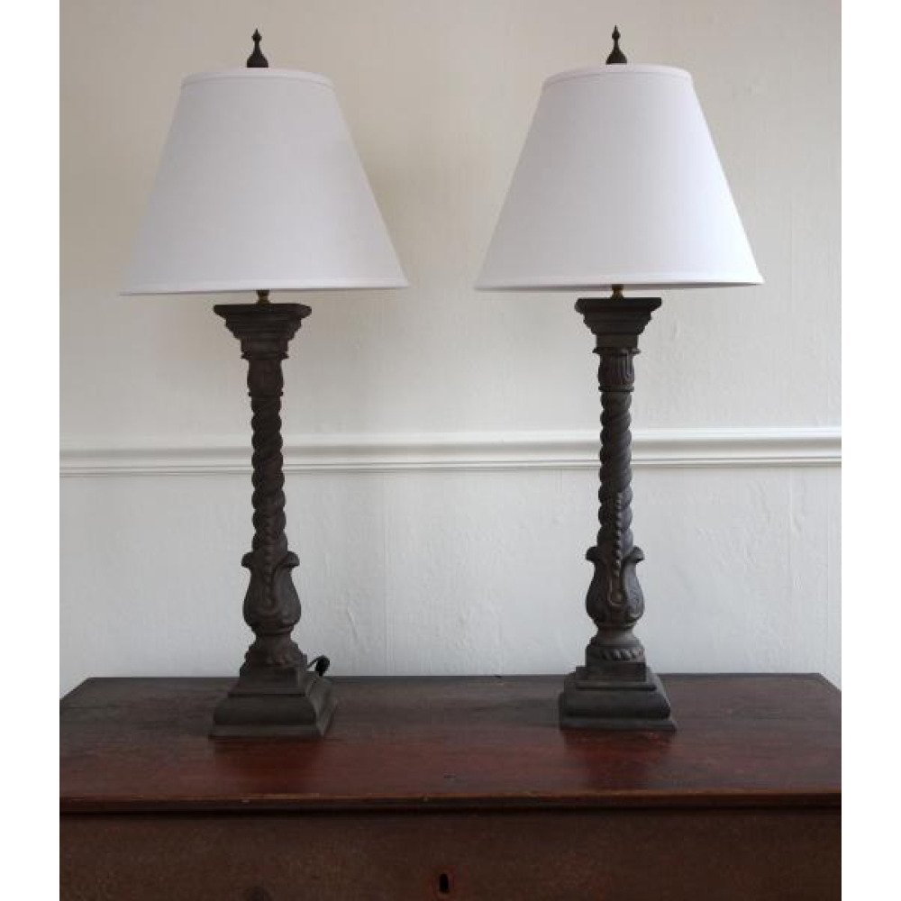 Pair of wonderful cast iron balusters, converted to lamps, custom wood base and cap made for each, as well as matching finials; probably American, circa 1880. Very good detail to the iron. Newly wired.