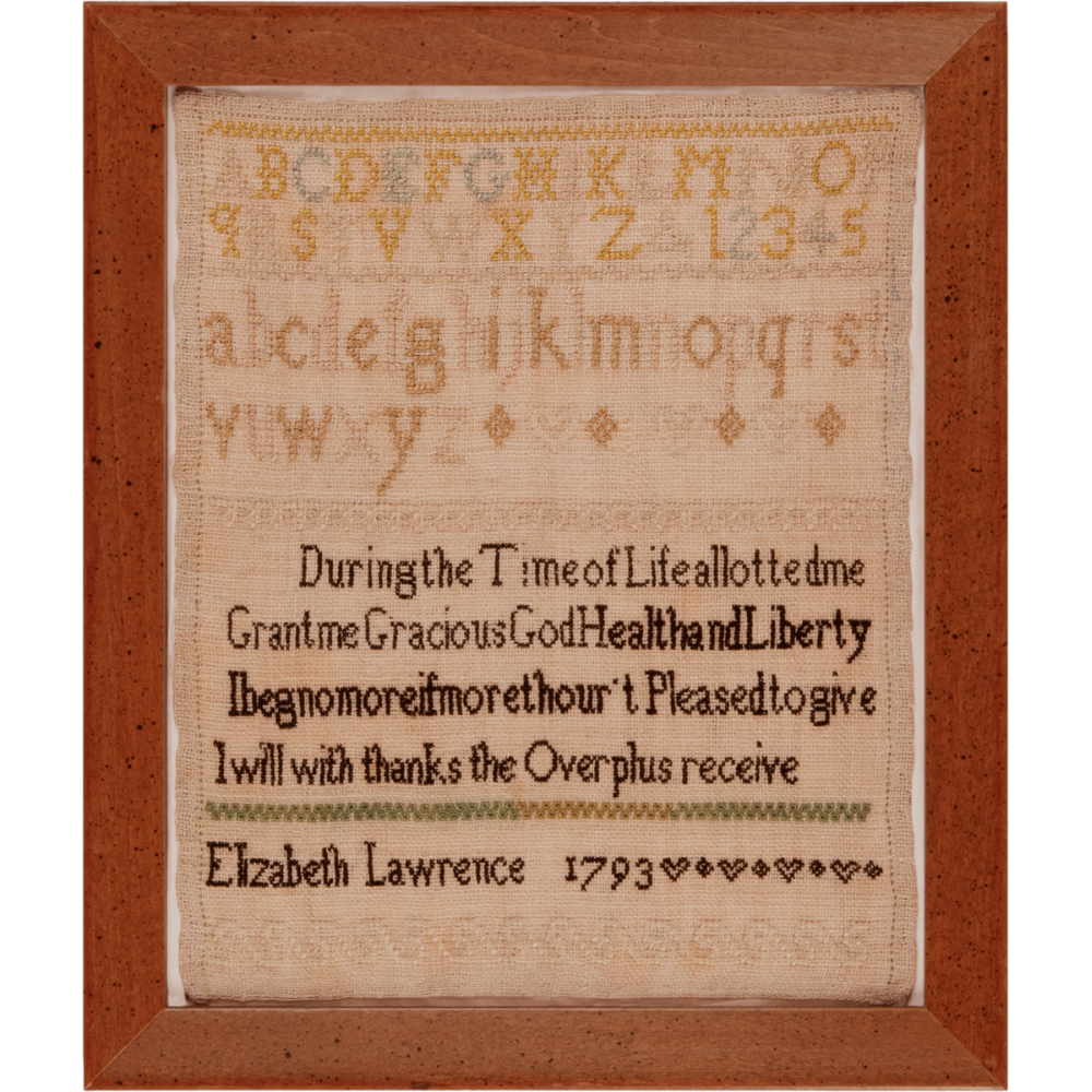 The sampler may have been one of Elizabeth Lawrence’s first needlework projects as her words run together, however her very neat stitching indicates a good level of competence. A photo taken of the back of the sampler prior to mounting is particularly instructive.