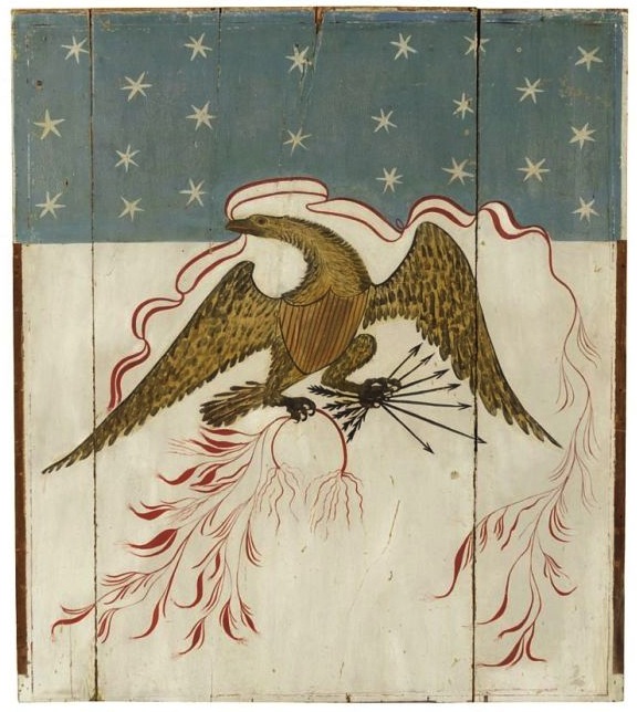About 1992, at the urging of a friend, he moved up to shows. "I didn't know anything about it. I picked the first one, in Carlisle, because I liked the ads," he says. He dealt largely in furniture and quilts, buying better ones as he moved up and gaining knowledge along the way. When he began making enough money as an Americana dealer, he quit his health-care research job and went to more and more fairs. At one in Nashville, he happened to see two small framed, nineteenth-century printed flags. "I didn't buy them, but I was struck by them and the price. I thought they were cheap for something so graphic," he says.